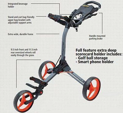 With an extra wide sturdy frame and a simple three-step fold for convenient storage. The upper bag bracket is cart and stand bag compatible, and it is developed to lock in stand bags.